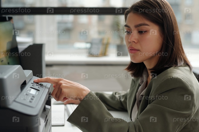 Молодая брюнетка-бизнесменка в сером блейзере нажимает кнопку на панели