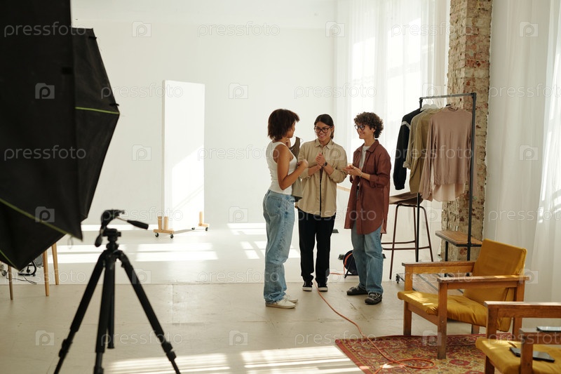 Молодой фотограф и стилист смотрит на модель женской моды в студии