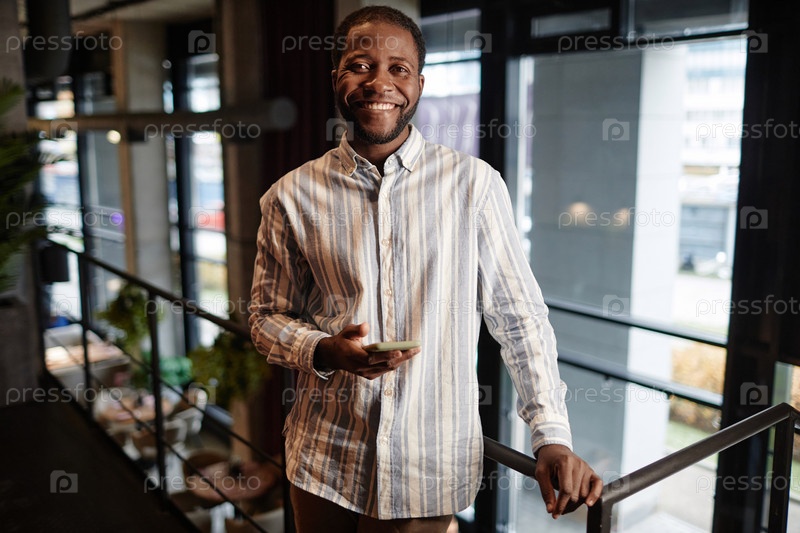Молодой веселый афроамериканец в полосатой рубашке смотрит на камеру