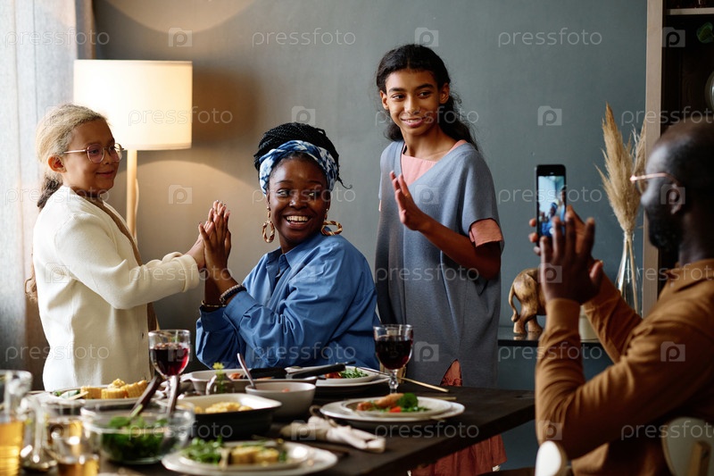 Две счастливые девочки и их улыбающаяся мать позируют молодому человеку со смартфоном