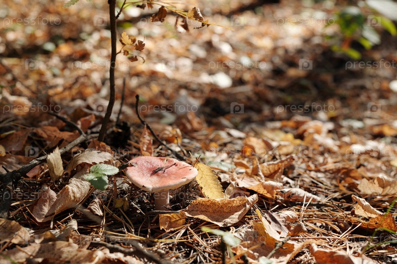 Одинокий гриб руссулы с красной шапочкой растет в лесу