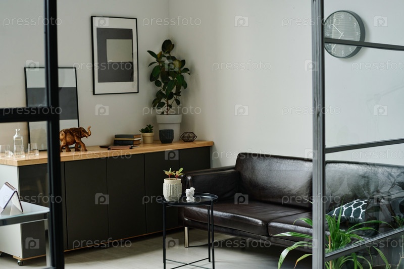 Уголок просторного высокотехнологичного офиса с удобным черным кожаным диваном
