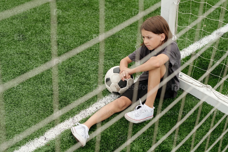 Печальный спокойный школьник в спортивной одежде, сидящий на зеленом футбольном поле