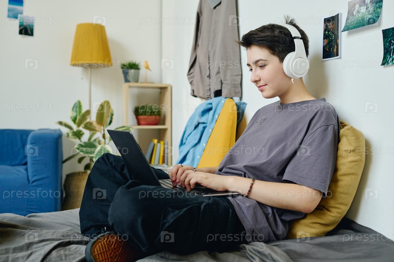 Девушка-подросток в наушниках смотрит на экран ноутбука и слушает музыку
