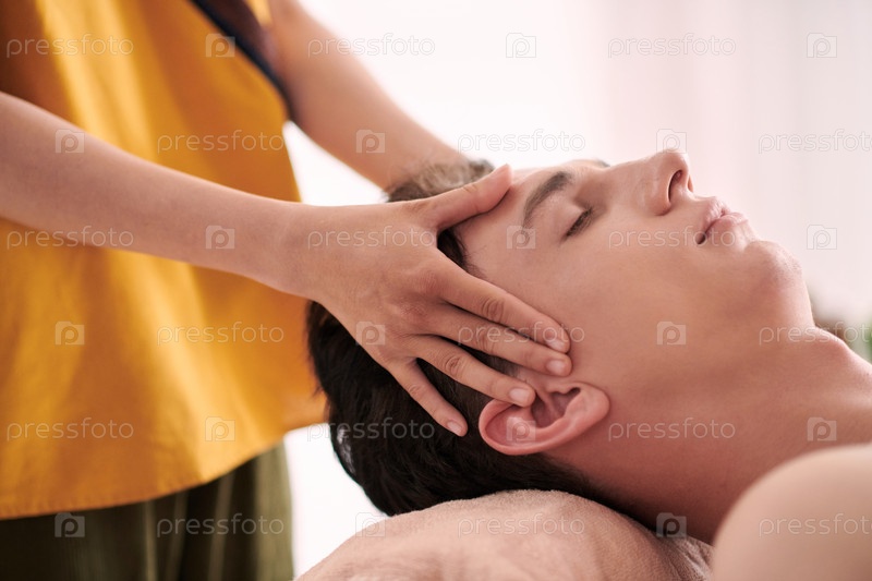 Руки молодой массажистки на храмах спокойного мультиэтнического парня