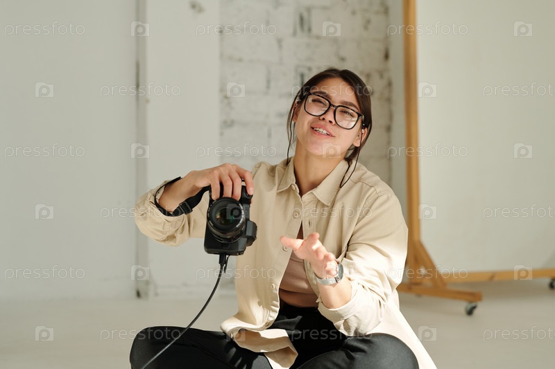 Счастливая молодая женщина-фотограф в очках и повседневной одежде, держащая фотоаппарат