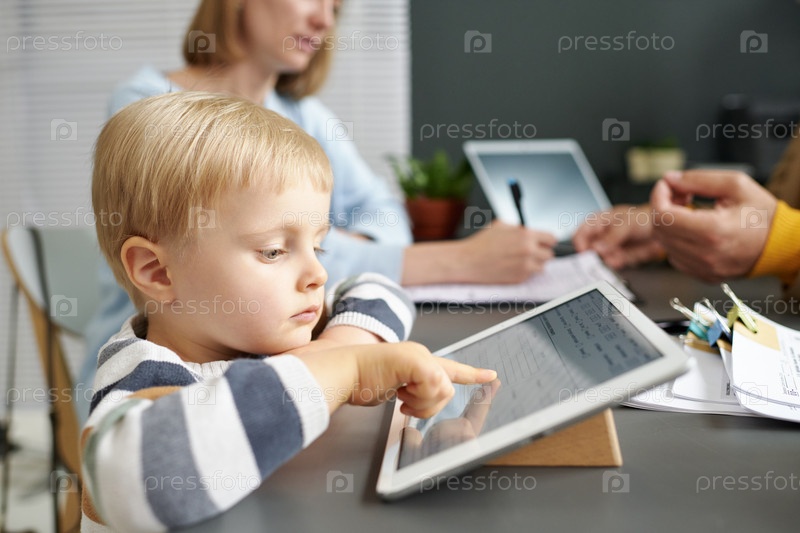 Маленький мальчик играет на планшетном компьютере в офисе