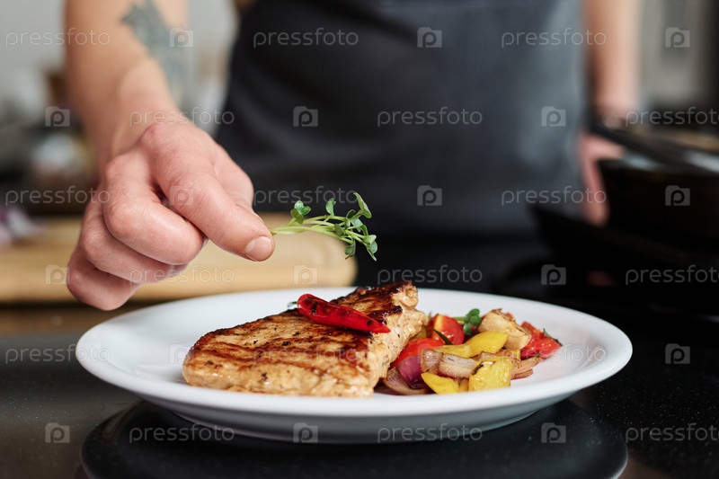 Человек, добавляющий микрозеленый к мясному блюду