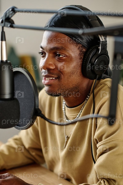 Молодой улыбающийся мужской ведущий разговаривает в микрофоне во время интервью с гостем
