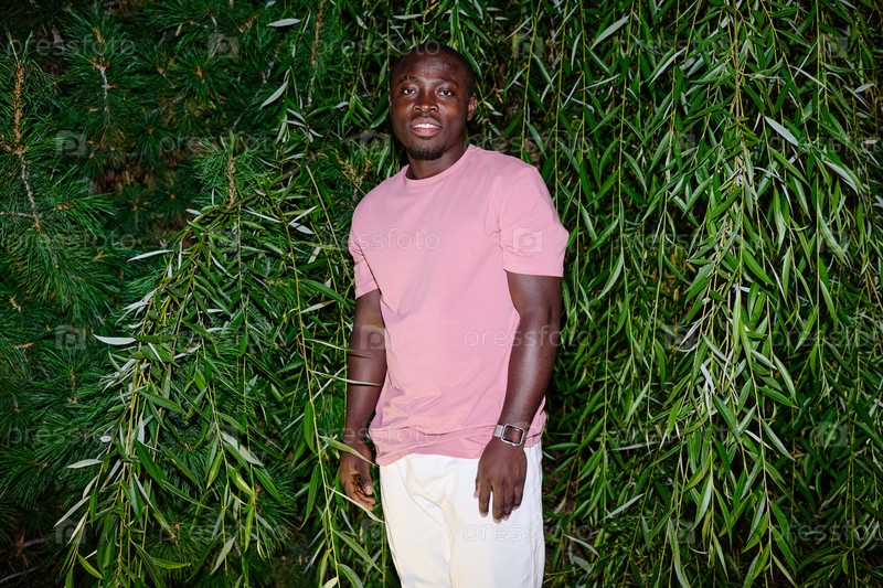 Счастливый молодой афроамериканец в повседневной одежде, стоящий на зеленых ветвях