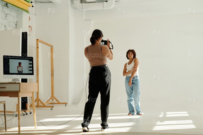 Длинный снимок молодой афроамериканки, позирующей перед камерой в студии