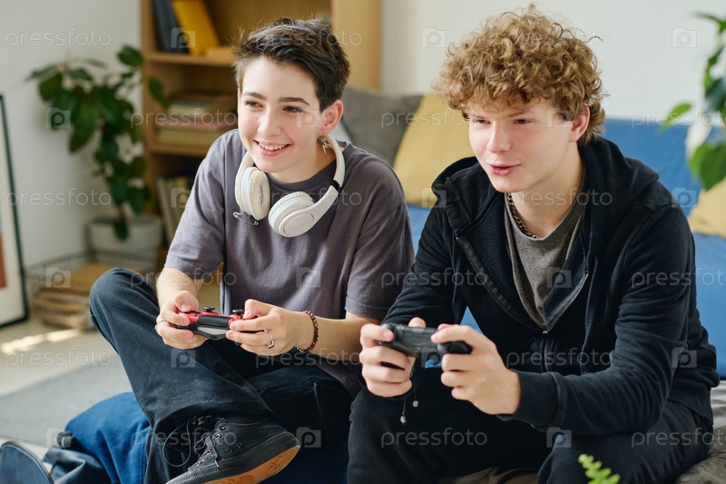 Счастливая девочка-подросток и ее парень нажимают кнопки на геймпадах
