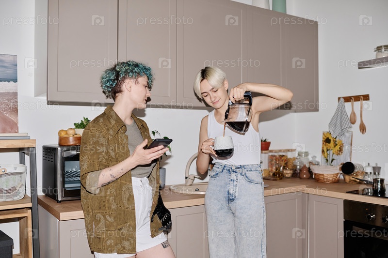 Девочки пьют кофе на кухне