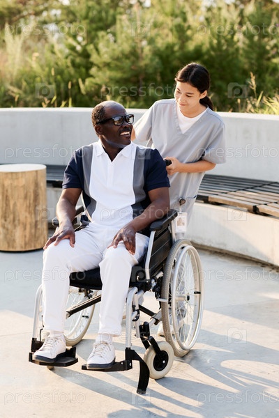 Опекун гуляет на открытом воздухе с пожилым человеком-инвалидом