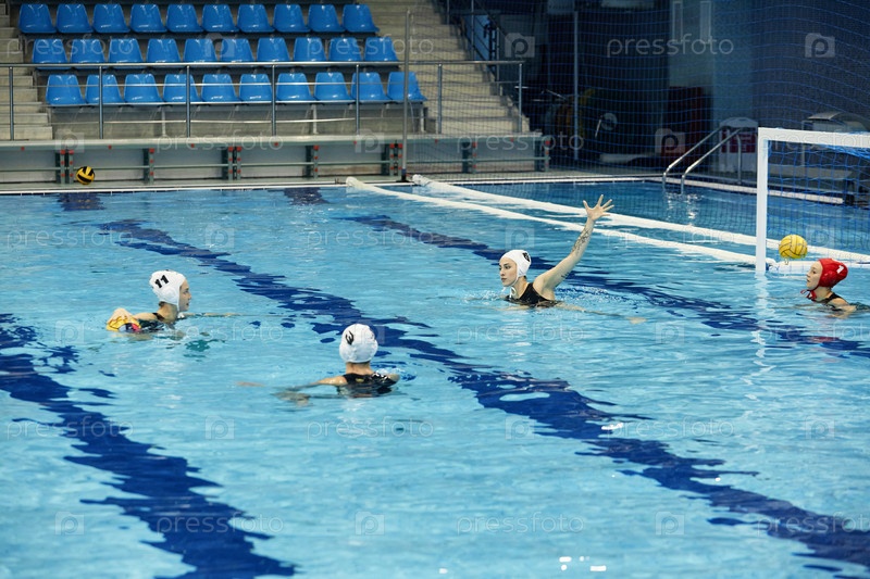 Два игрока в водное поло атакуют соперническую команду, а одна из девочек бросает мяч
