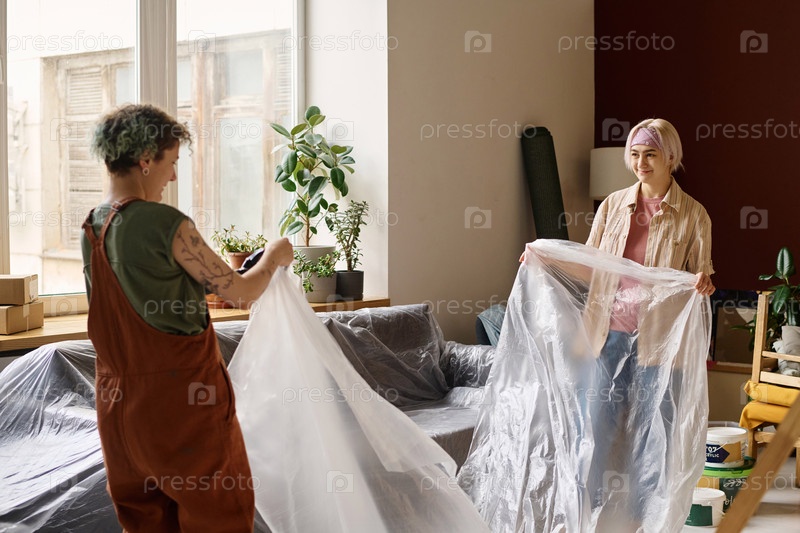 Женщины, покрывающие мебель, чтобы сделать ремонт