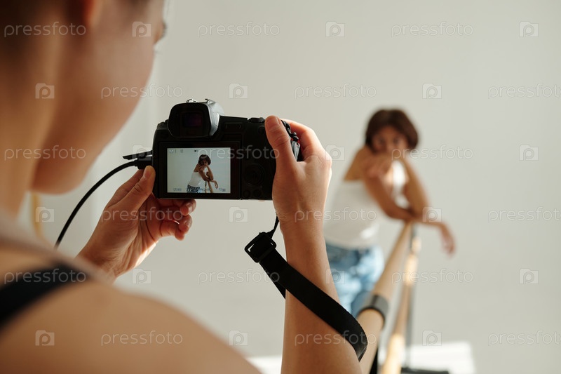 Экран фотоаппарата, удерживаемый женщиной-фотографом с снимком модной модели