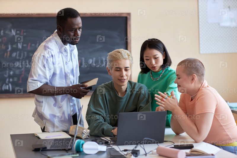 Группа молодых межкультурных студентов или ИТ-инженеров, обсуждающих онлайн-данные
