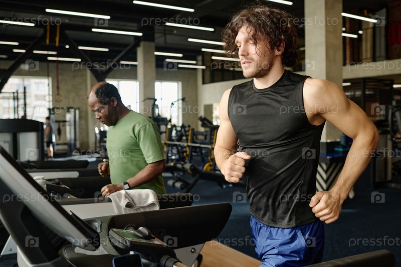 Два мужчины тренируются на беговой дорожке в спортзале