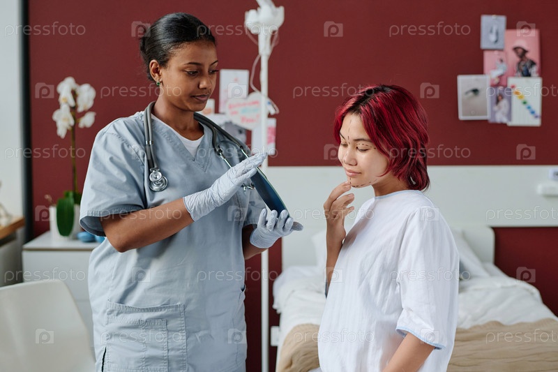 Молодой профессиональный пластический хирург держит зеркало перед девочкой-подростком