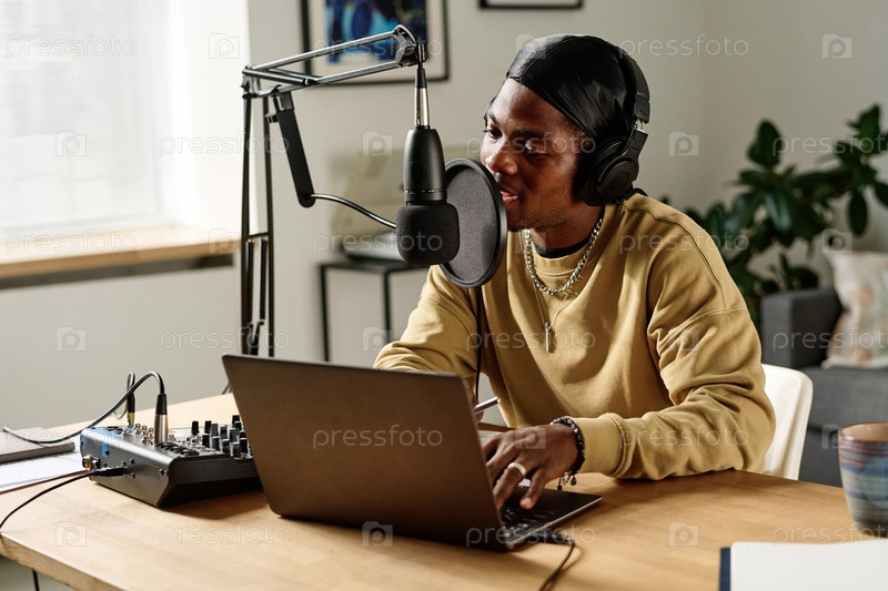 Молодой афроамериканский мужчина в наушниках, говорящий или поющий в микрофоне