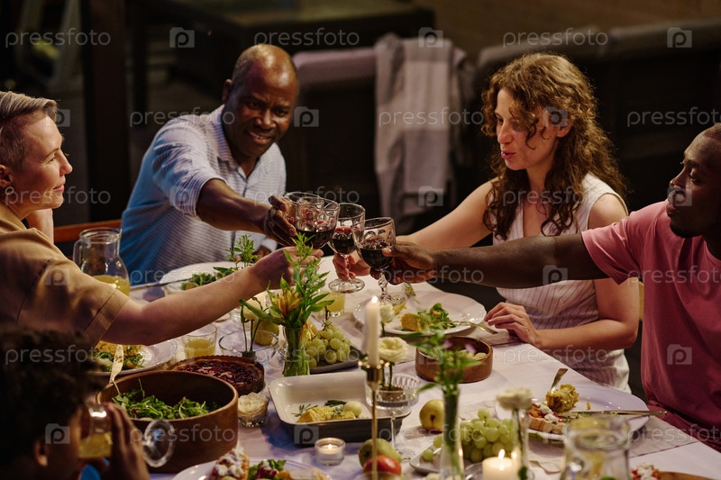 Межкультурная семья из пяти человек сидит за обслуживаемым столом и тостирует красным вином