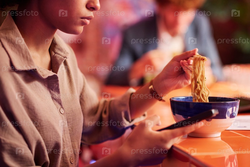 Вырезанный снимок молодой голодной женщины с мобильным телефоном, которая ест рамен