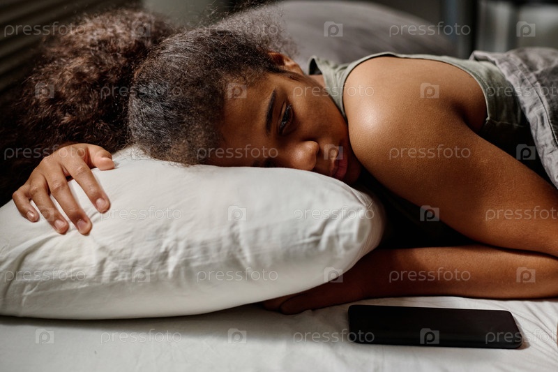 Депрессивная девочка-подросток держит голову на подушке, лежа в постели