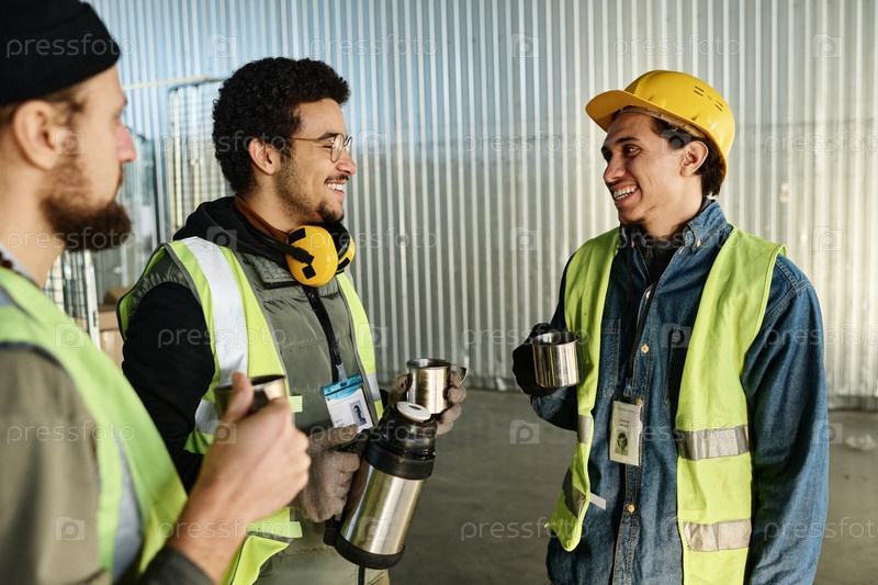 Сосредоточьтесь на двух молодых веселых мультиэтнических инженерах в отражающих жилетах