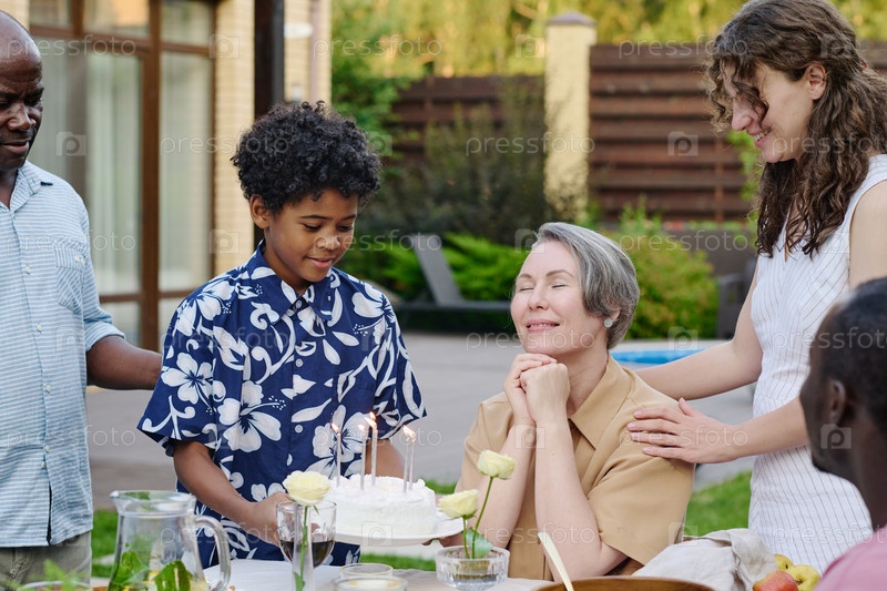 Милый мальчик приносит бабушке торт с горящими свечами