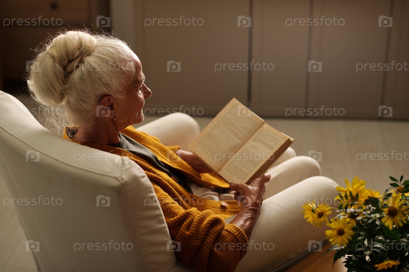 Сосредоточьтесь на пожилой женщине с белыми волосами, держащей открытую книгу и читающей ее