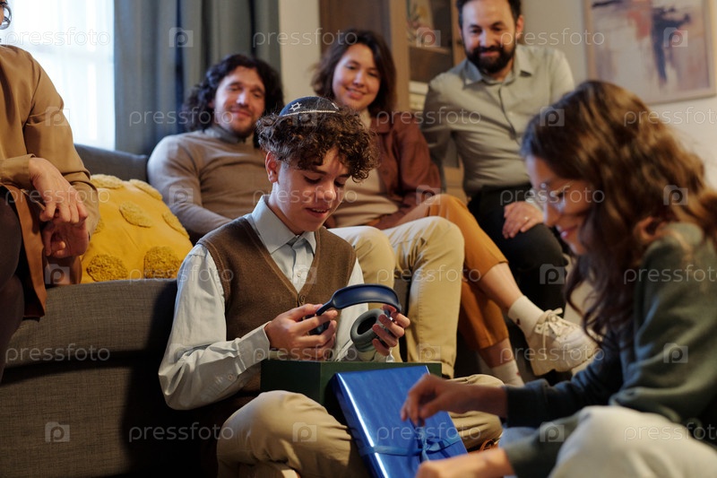 Счастливый до-подросток еврейский мальчик в киппе смотрит на наушники