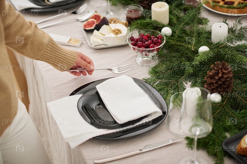 Хозяйка устраивает столовые принадлежности на праздничном столе в канун Рождества