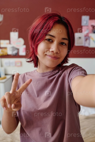 Милая улыбающаяся азиатская девочка-подросток с жестом мира смотрит на тебя