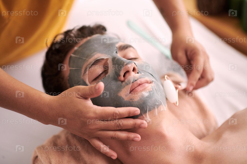 Рука косметолога, касающейся лица молодого клиента-мужчины с маской