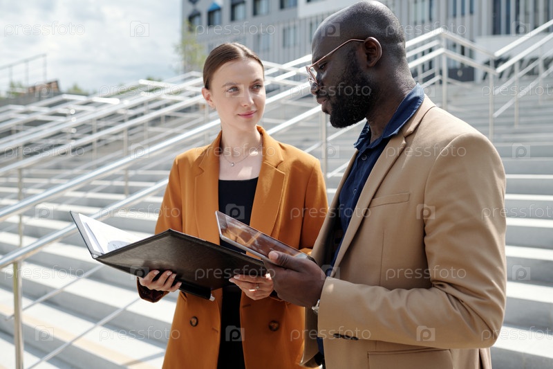Молодой уверенный в себе бизнесмен с планшетом и его коллегой