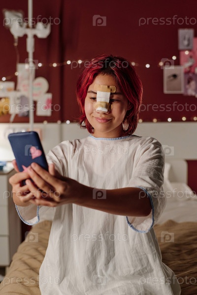 Молодая блогерка с повязкой на носу ведет прямую трансляцию