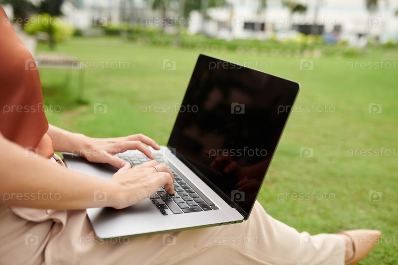 Деловая женщина, работающая на ноутбуке в парке