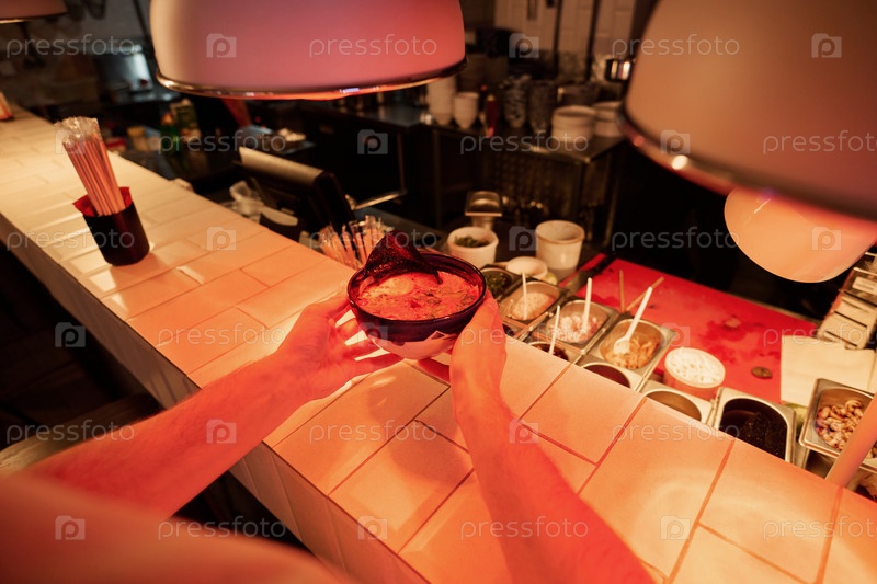 Чаша с аппетитным раменом в руках молодого человека, держащего еду на стойке