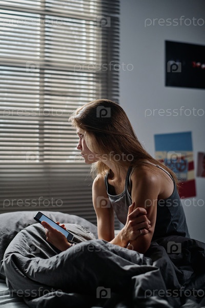 Оскорбленная девушка-подросток в сером жилете, сидящая на кровати у окна