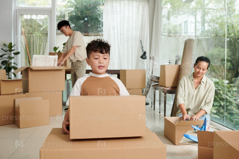 Мальчик-подросток помогает родителям упаковать вещи