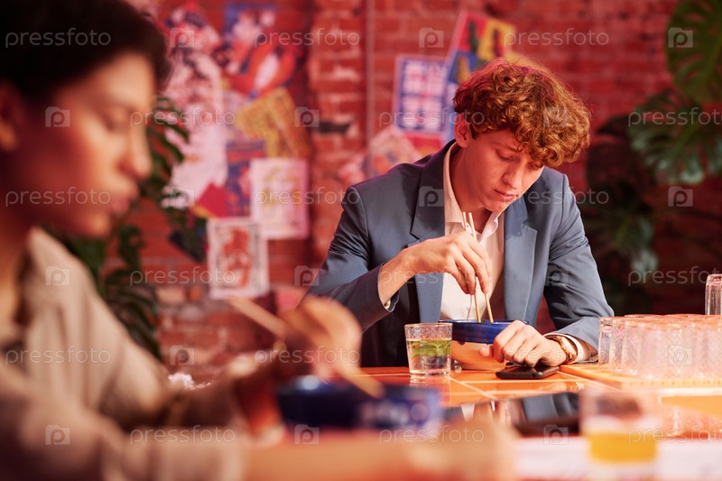 Сосредоточьтесь на молодом бизнесмене в формальной одежде, который ест рамен с палочками