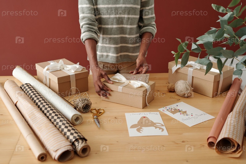 Женщина кладет открытку на подарочный ящик сверху