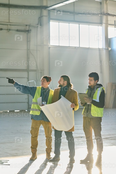 Молодой уверенный в себе инженер-мужчина показывает на стену склада во время дискуссии