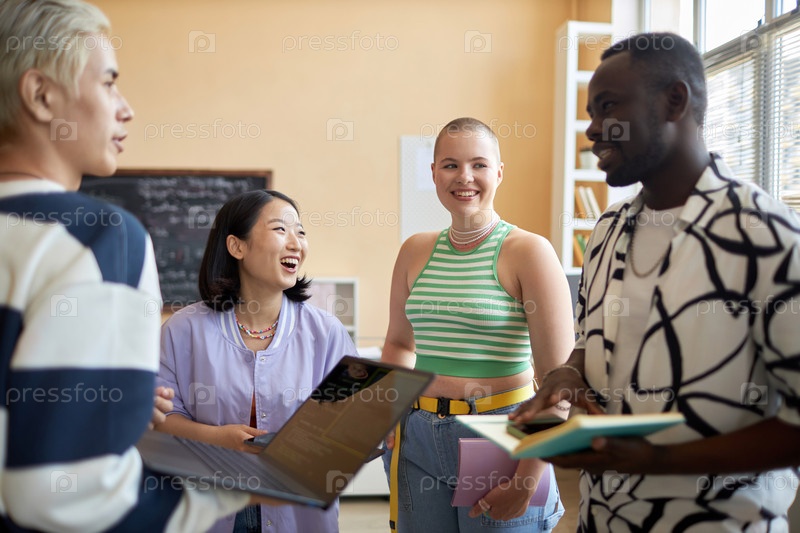 Молодая смеющаяся азиатская женщина и ее одноклассница смотрят на афроамериканского парня