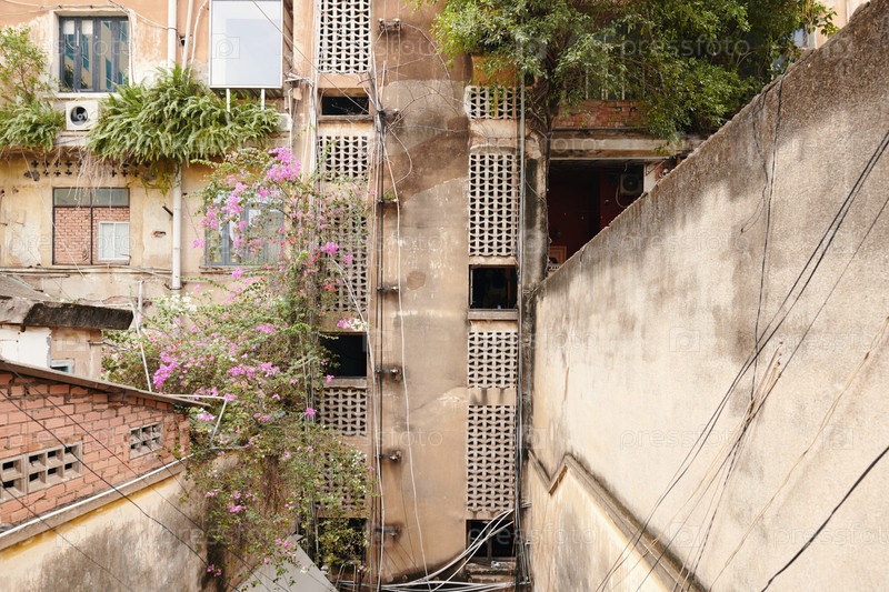Старый жилой дом с растениями, растущими на стенах