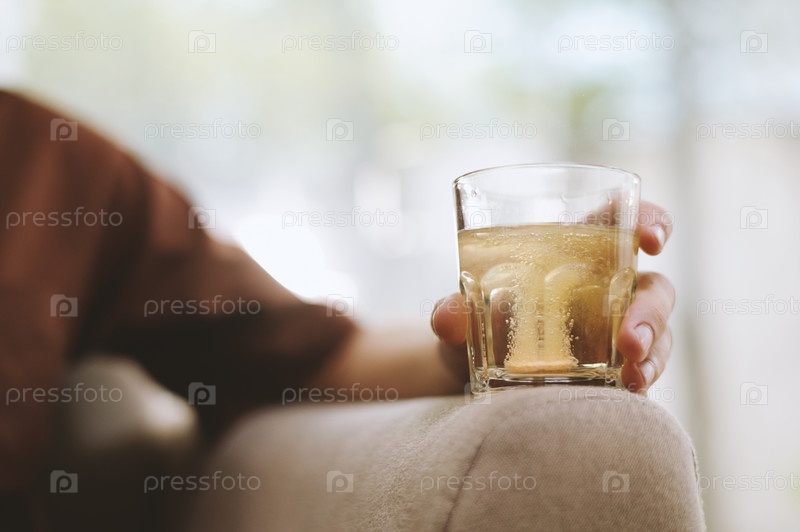 Дымчатая таблетка, растворяющаяся в стакане воды в руке молодого человека