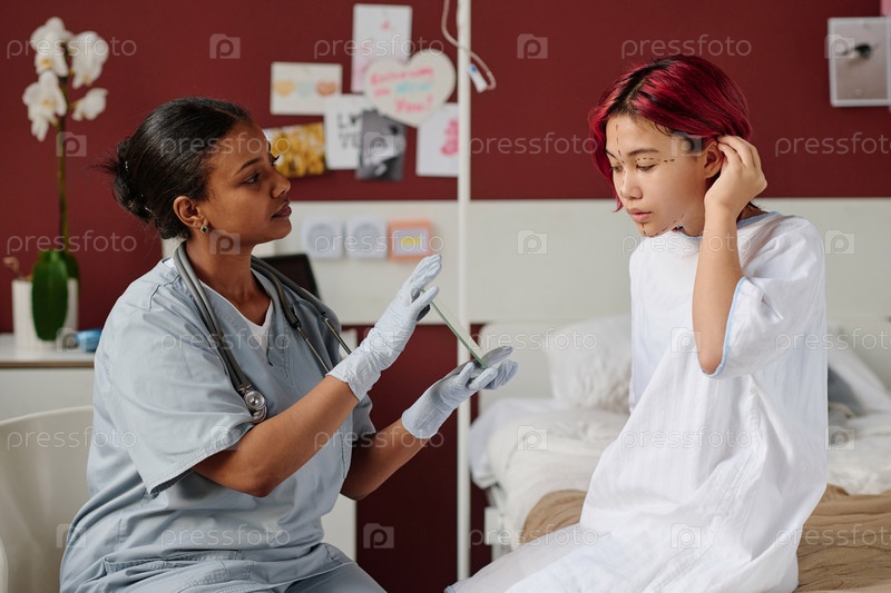 Молодой пластический хирург держит зеркало перед подростковым пациентом