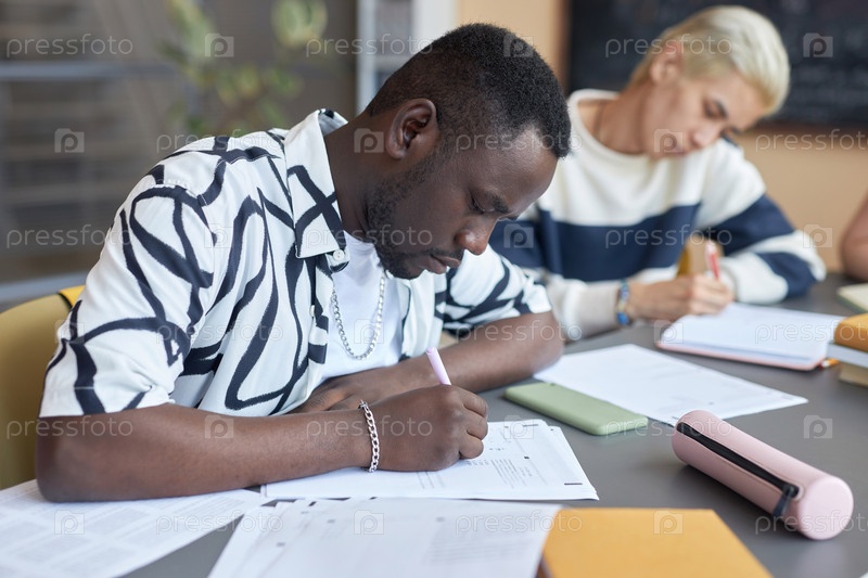 Серьезный афроамериканский парень делает заметки или ставит клещи на экзаменационную бумагу