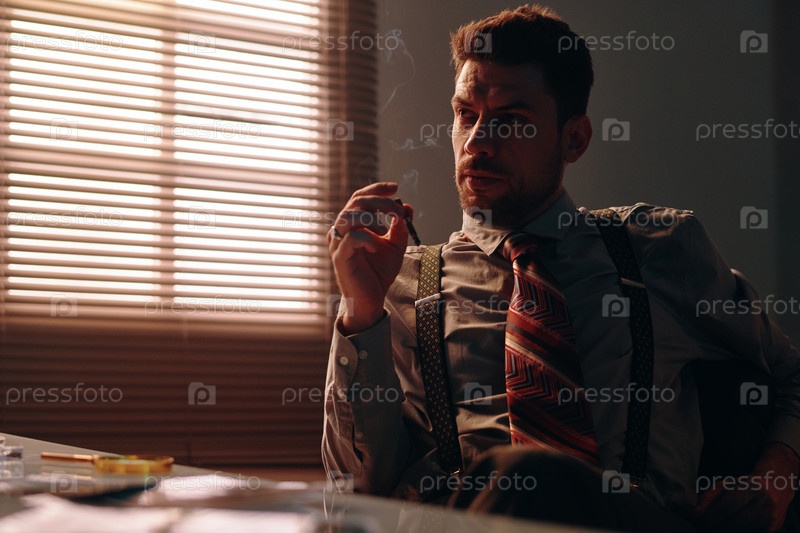 Молодой мыслящий мужчина думает о чем-то и курит сигарету